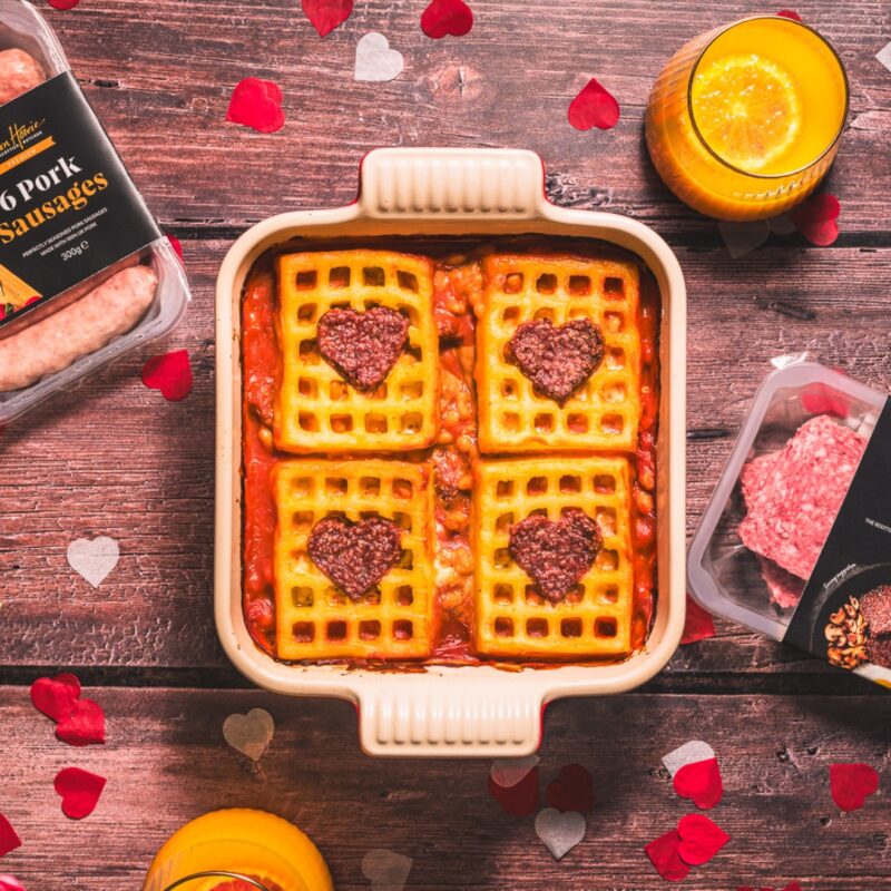 Heart-shaped Lorne, pork link sausage, waffles, beans and melted cheese all baked into one ultimate 𝗟𝗼𝘃𝗲 𝗦𝗮𝘂𝘀𝗮𝗴𝗲 𝗣𝗶𝗲.